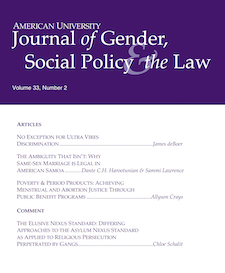 The American University Journal of Gender, Social Policy & the Law, founded in 1992, provides a forum for those interested in gender issues and feminist legal studies. In 1998, the Journal expanded its mission to include social policy as well as gender issues. Our current approach reflects our intent to fill a void in legal scholarship by providing an opportunity for academic discussion that is otherwise overlooked by traditional journals. By focusing on gender and social policy issues, we are committed to creating a dialogue among disparate social, economic, and gender groups in order to find our common humanity under the law.