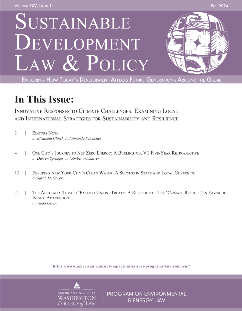 Sustainable Development Law & Policy journal is a student-run initiative at American University Washington College of Law that focuses on reconciling the tensions between environmental sustainability, economic development, and human welfare. The SDLP journal embraces an interdisciplinary approach to provide a fuller view of current legal, political, and social developments. Our mission is to serve as a valuable resource for practitioners, policy makers, and concerned citizens promoting sustainable development throughout the world.